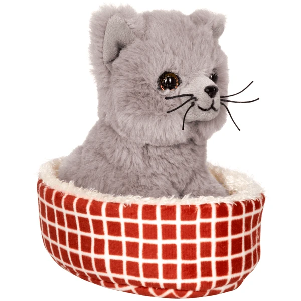 - Das kuschelweiche Kätzchen hat graues Fell und bringt einen gemütlichen, rot-karierten Korb mit